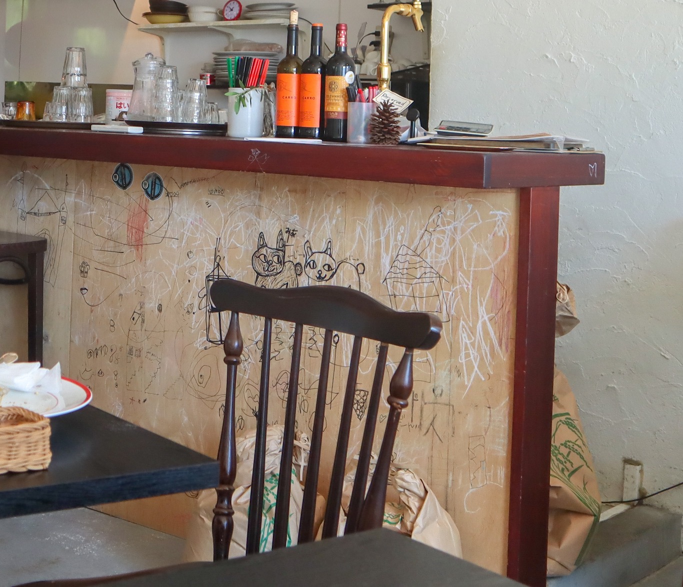 カウンターの下には、小さなお子さんが書いたであろう大胆で微笑ましい落書きがあります。